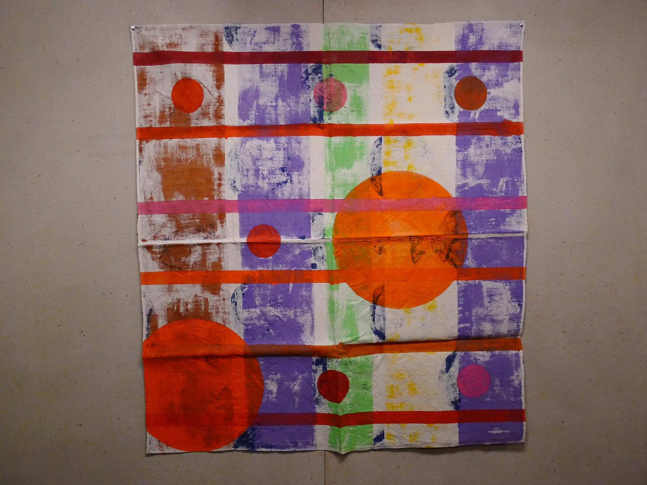 Spheres Stripes, side 2, from Particles series, acrylic on vintage Italian military linen
