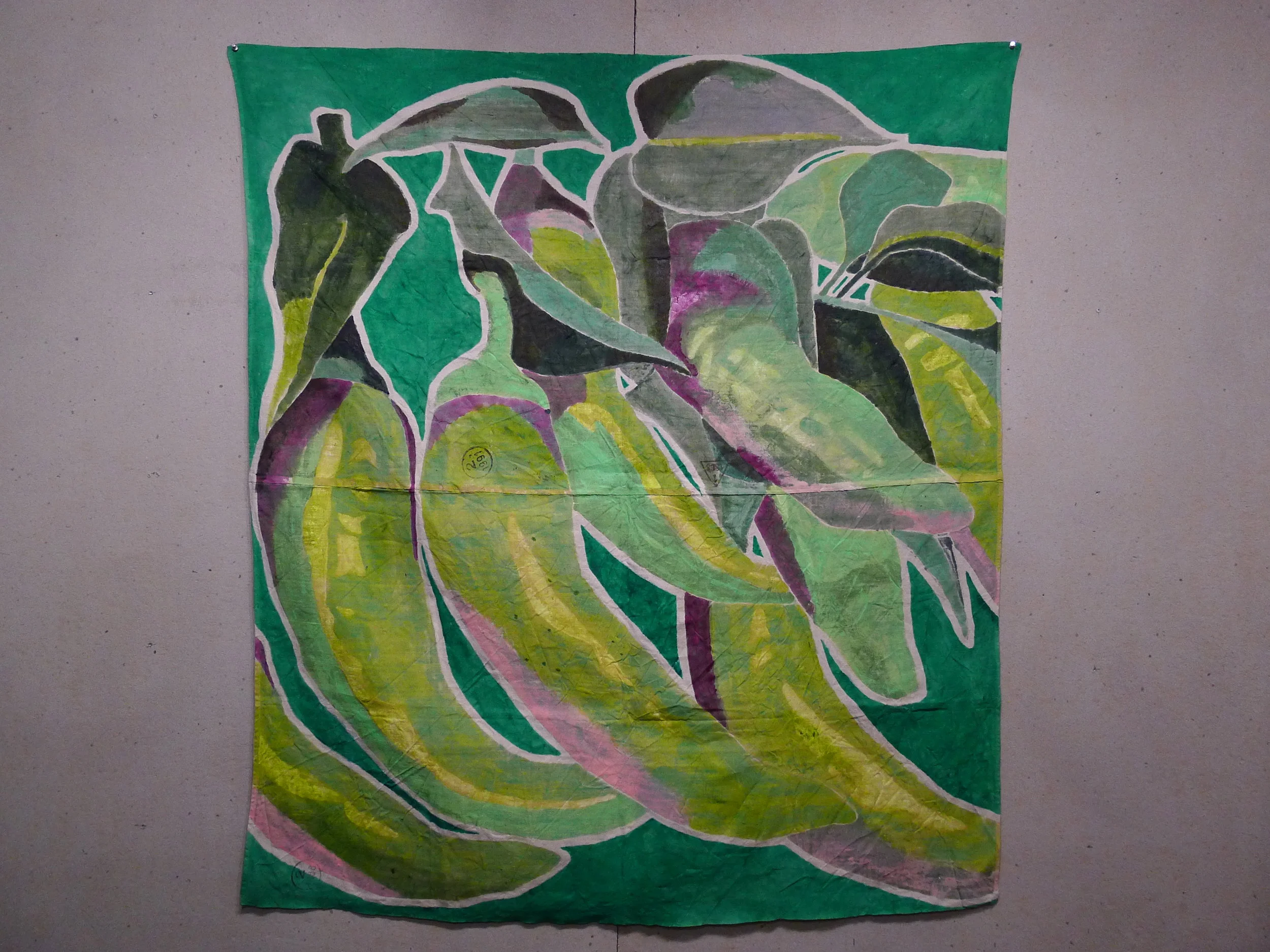 Peppers, side 2, from Seed Packet series, acrylic on vintage Italian military linen